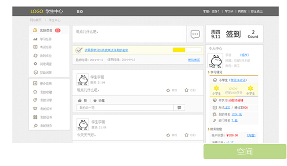 学员可以看到像QQ空间一样的社区,在这里我们可以看到同学们的学习动态和学习知识的分享,我们可以在这里留言互评,共同创建一个学习的社区!